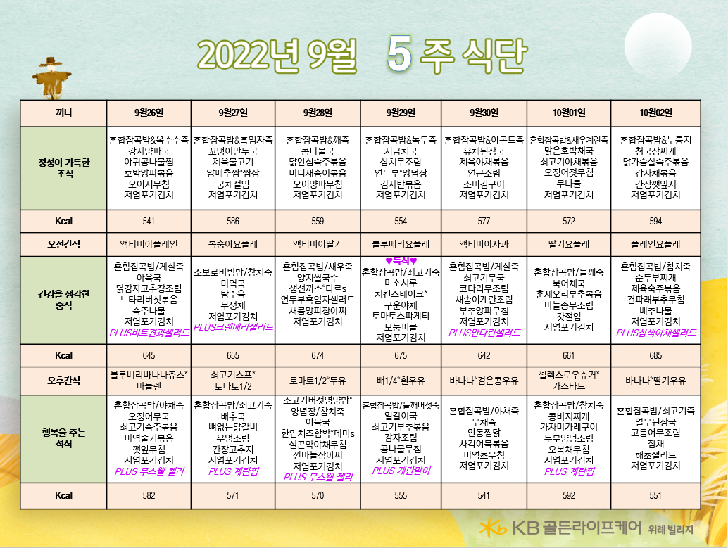 위례빌리지 [식단안내] 위례 빌리지 9월 5주차 식단표 페이지 정보 작성자 KB 골든라이프케어 댓글 0건 조회 2,387회 작성일 22-09-23 11:14 목록 본문 목록 이전글[식단안내] 위례 케어센터 9월 5주차 식단표 22.09.23 다음글[ 오늘의 식단 ] 2022년 9월 22일 금요일 22.09.22