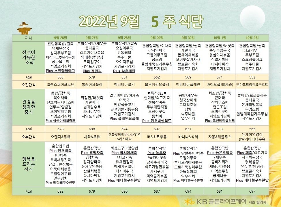 서초빌리지 [식단안내] 서초 빌리지 9월 5주차 식단표 페이지 정보 작성자 KB 골든라이프케어 댓글 0건 조회 2,377회 작성일 22-09-23 14:27 목록 본문 목록 이전글[프로그램 안내] 2022년 위례 빌리지 10월 프로그램 일정표 22.09.27 다음글[식단안내] 위례 케어센터 9월 5주차 식단표 22.09.23