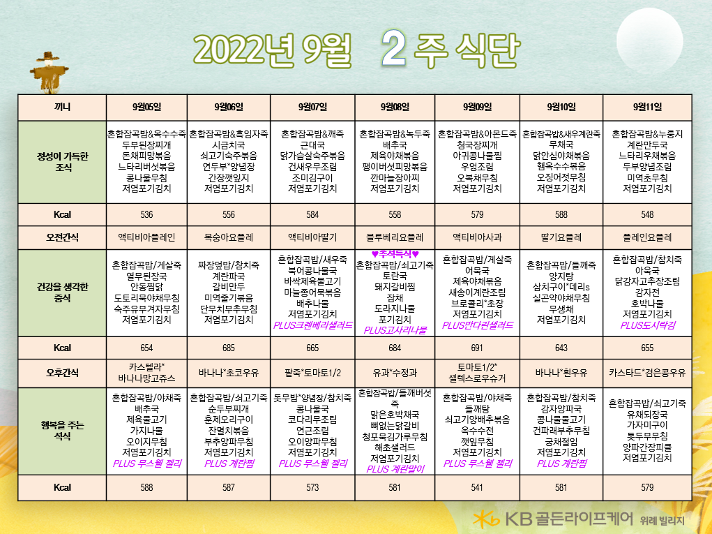 위례빌리지 [식단안내] 위례 빌리지 9월 2주차 식단표 페이지 정보 작성자 KB 골든라이프케어 댓글 0건 조회 2,731회 작성일 22-09-01 13:01 목록 본문 목록 이전글[식단안내] 위례 빌리지 9월 2주차 식단표 22.09.01 다음글[ 오늘의 식단 ] 2022년 9월 1일 목요일 22.09.01
