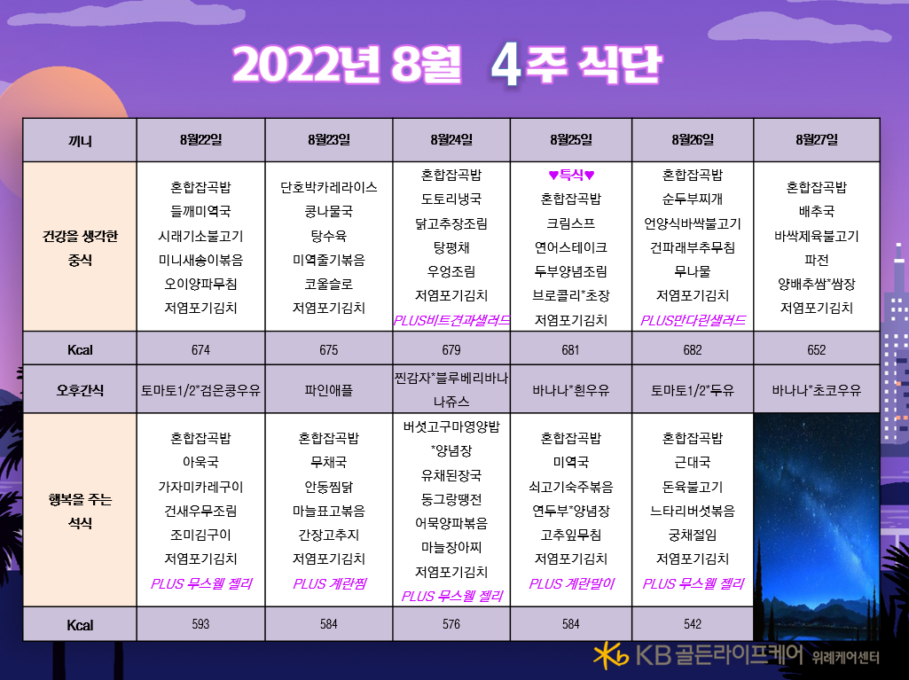 위례케어센터 [식단안내] 위례 케어센터 8월 4주차 식단표 페이지 정보 작성자 KB 골든라이프케어 댓글 0건 조회 2,635회 작성일 22-08-18 18:14 목록 본문 목록 이전글[오늘의식단] 2022년 8월 23일 화요일 22.08.23 다음글[식단안내] 위례 빌리지 8월 4주차 식단표 22.08.18