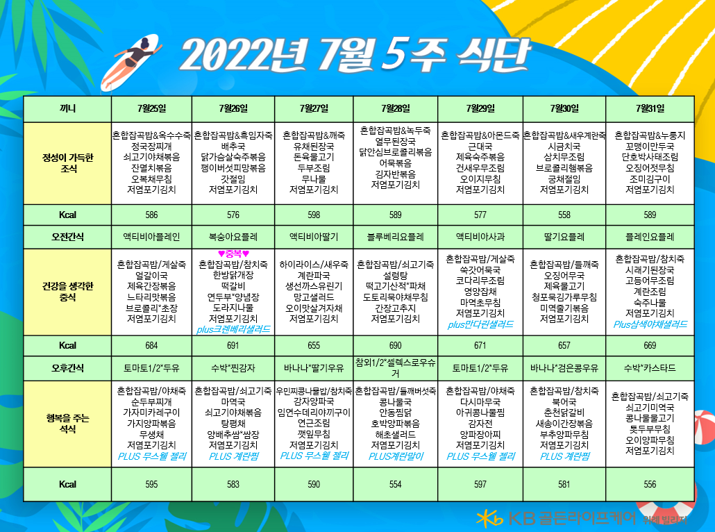 위례빌리지 [식단안내] 위례 빌리지 7월 5주차 식단표 페이지 정보 작성자 KB 골든라이프케어 댓글 0건 조회 2,711회 작성일 22-07-25 09:18 목록 본문 목록 이전글[식단안내] 위례 케어센터 7월 5주차 식단표 22.07.25 다음글[식단안내] 서초 빌리지 7월 5주차 식단표 22.07.23