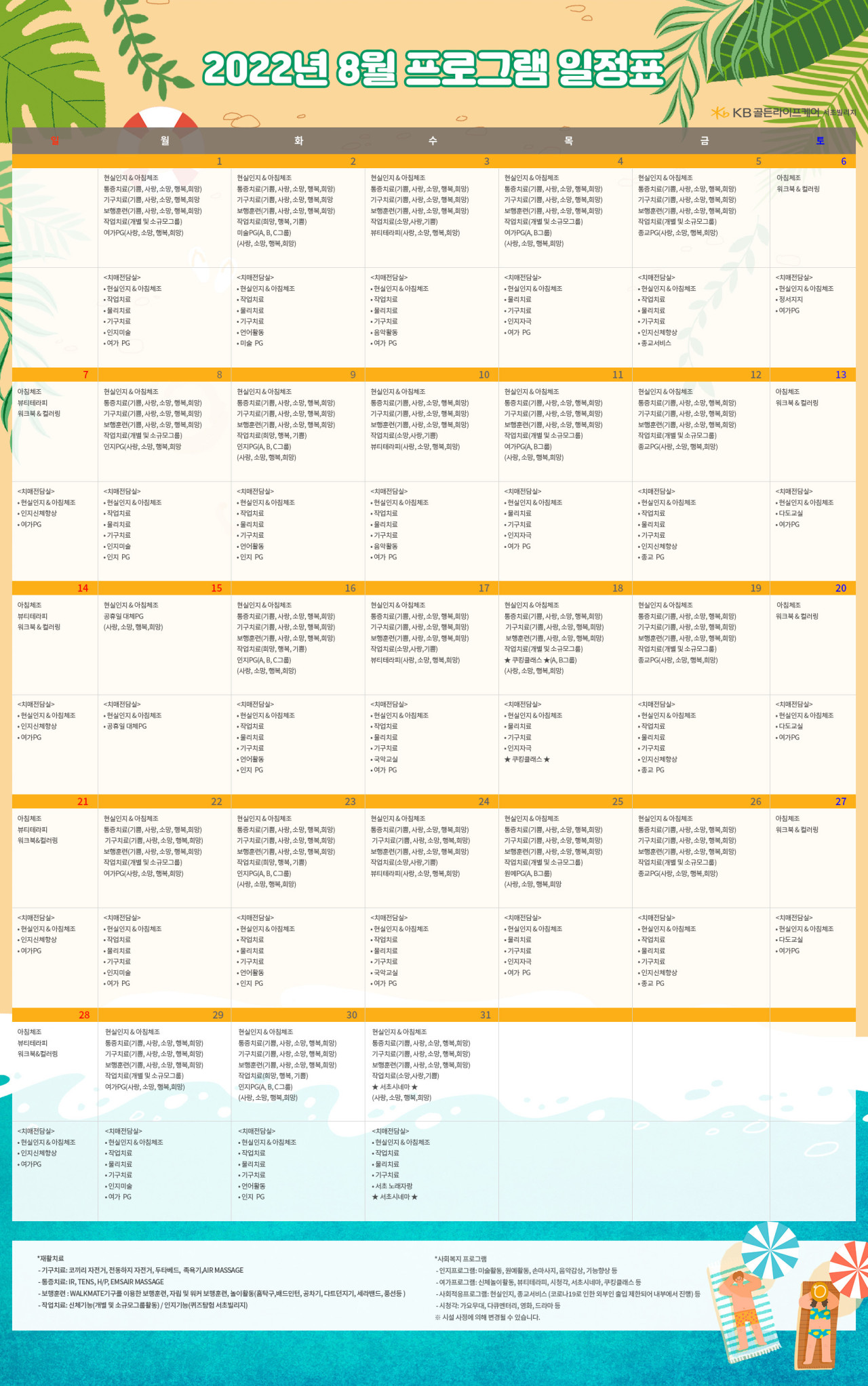 서초빌리지 [프로그램안내] 2022년 서초 빌리지 8월 프로그램 일정표 페이지 정보 작성자 KB 골든라이프케어 댓글 0건 조회 3,577회 작성일 22-07-26 08:40 목록 본문 목록 이전글[ 오늘의 식단 ] 2022년 7월27일 수요일 22.07.27 다음글[식단안내] 위례 케어센터 7월 5주차 식단표 22.07.25