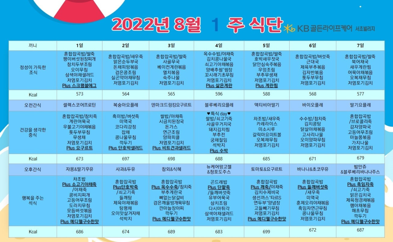 서초빌리지 [식단안내] 서초 빌리지 8월 1주차 식단표 페이지 정보 작성자 KB 골든라이프케어 댓글 0건 조회 2,650회 작성일 22-07-29 15:00 목록 본문 목록 이전글[프로그램 안내] 2022년 위례 케어센터 8월 프로그램 일정표 22.07.29 다음글[프로그램 안내] 2022년 위례 빌리지 8월 프로그램 일정표 22.07.29