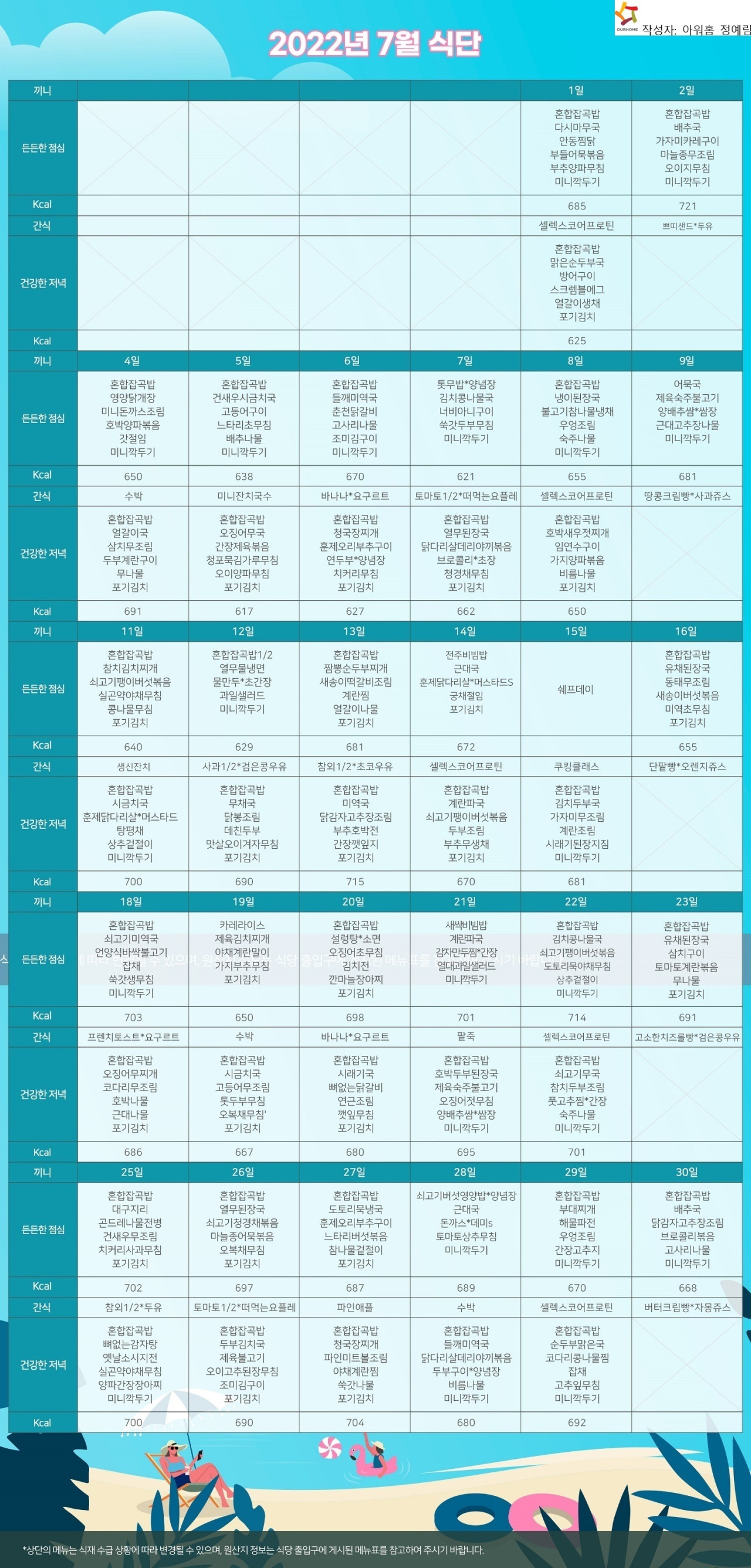 강동케어센터 [식단 안내] 2022년 강동케어센터 7월 식단표 페이지 정보 작성자 KB 골든라이프케어 댓글 0건 조회 2,703회 작성일 22-07-02 11:27 목록 본문 목록 이전글[오늘의식단] 2022년 7월 5일 화요일 22.07.05 다음글[프로그램 안내] 2022년 강동케어센터 7월 프로그램 일정표 22.07.02