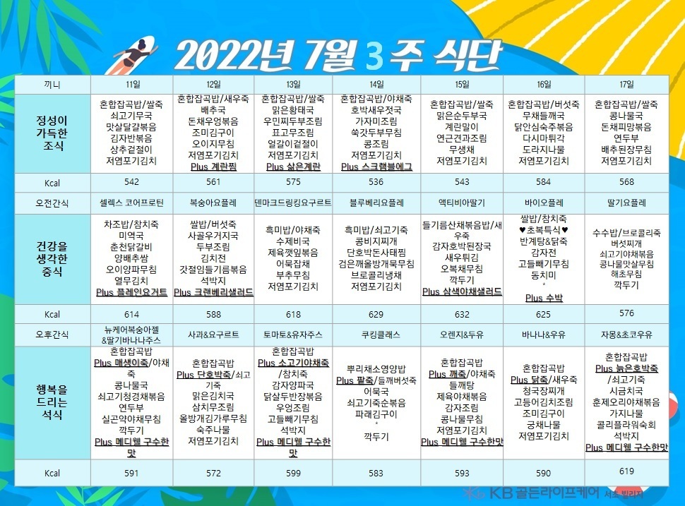 서초빌리지 [식단안내] 서초 빌리지 7월 3주차 식단표 페이지 정보 작성자 KB 골든라이프케어 댓글 0건 조회 2,559회 작성일 22-07-08 15:41 목록 본문 목록 이전글[식단안내] 위례 빌리지 7월 3주차 식단표 22.07.08 다음글[ 오늘의 식단 ] 2022년 7월 7일 목요일 22.07.07