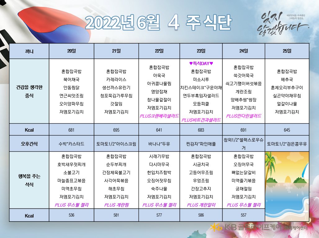 위례케어센터 [식단안내] 위례 케어센터 6월 4주차 식단표 페이지 정보 작성자 KB 골든라이프케어 댓글 0건 조회 2,656회 작성일 22-06-17 10:51 목록 본문 목록 이전글[식단안내] 서초 빌리지 6월 4주차 식단표 22.06.17 다음글[식단안내] 위례 빌리지 6월 4주차 식단표 22.06.17