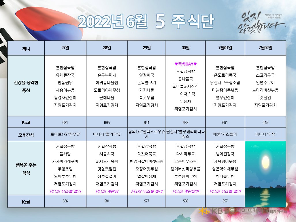 위례케어센터 [식단안내] 위례 케어센터 6월 5주차 식단표 페이지 정보 작성자 KB 골든라이프케어 댓글 0건 조회 2,542회 작성일 22-06-23 15:30 목록 본문 목록 이전글[ 오늘의 식단 ] 2022년 6월 23일 목요일 22.06.23 다음글[식단안내] 위례 빌리지 6월 5주차 식단표 22.06.23
