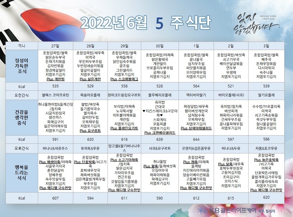 서초빌리지 [식단안내] 서초 빌리지 6월 5주차 식단표 페이지 정보 작성자 KB 골든라이프케어 댓글 0건 조회 2,700회 작성일 22-06-24 11:17 목록 본문 목록 이전글[프로그램안내] 2022년 서초 빌리지 7월 프로그램 일정표 22.06.28 다음글[ 오늘의 식단 ] 2022년 6월 23일 목요일 22.06.23