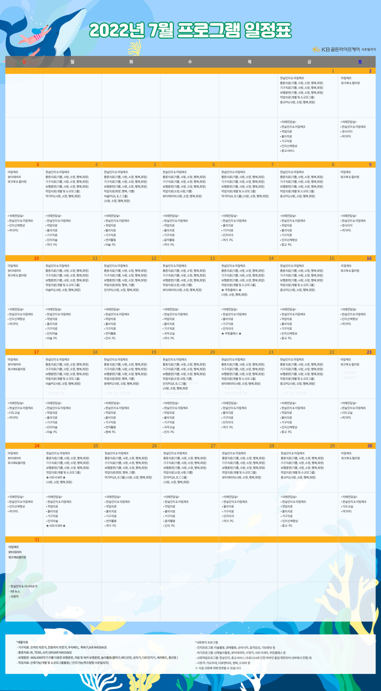 서초빌리지 [프로그램안내] 2022년 서초 빌리지 7월 프로그램 일정표 페이지 정보 작성자 KB 골든라이프케어 댓글 0건 조회 3,140회 작성일 22-06-28 09:15 목록 본문 목록 이전글[오늘의식단] 2022년 6월 28일 화요일 22.06.28 다음글[식단안내] 서초 빌리지 6월 5주차 식단표 22.06.24