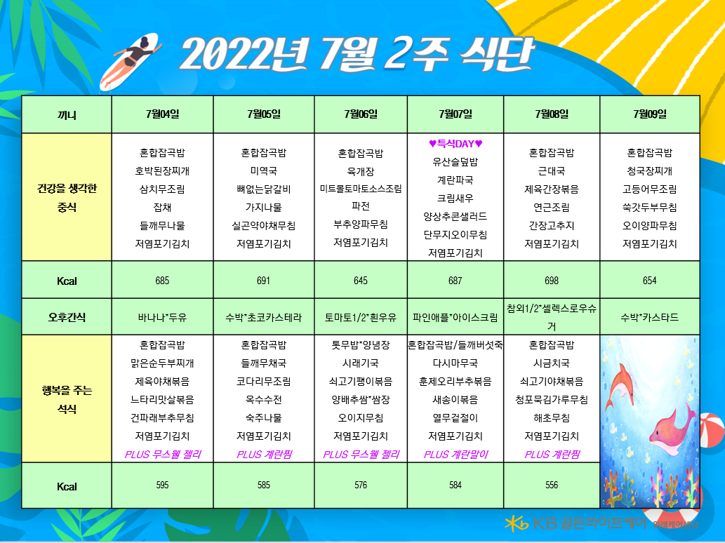 위례케어센터 [식단안내] 위례 케어센터 7월 2주차 식단표 페이지 정보 작성자 KB 골든라이프케어 댓글 0건 조회 2,602회 작성일 22-07-01 10:10 목록 본문 목록 이전글[식단안내] 서초 빌리지 7월 2주차 식단표 22.07.01 다음글[식단안내] 위례 빌리지 7월 2주차 식단표 22.07.01