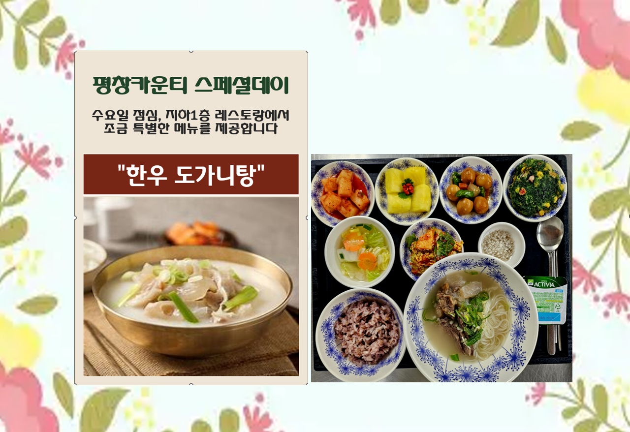 평창카운티 2025.12.24 Special Day 페이지 정보 작성자 최고관리자 댓글 0건 조회 451회 작성일 25-12-24 17:25 목록 본문 "한우도가니탕" 잡곡밥, 낙지물파래전, 꽈리메추리알조림, 봄동사과무침, 파인애플/요플레, 깍두기/나박김치 목록 이전글[하루의 식단] 2025년 12월 24일 25.12.26 다음글[하루의식단] 2025년 12월 23일 25.12.23