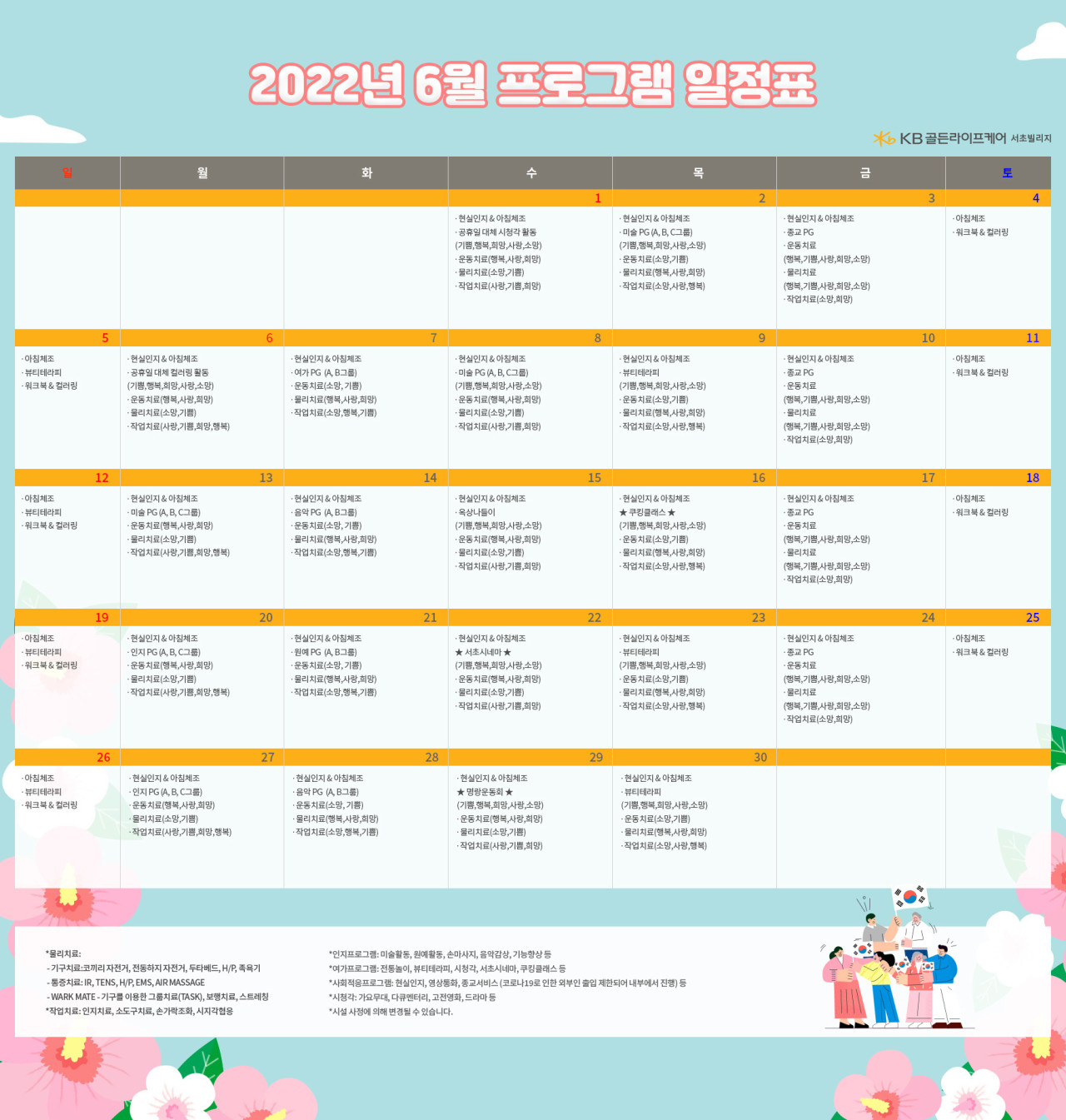 서초빌리지 [프로그램안내] 2022년 서초 빌리지 6월 프로그램 일정표 페이지 정보 작성자 KB 골든라이프케어 댓글 0건 조회 3,466회 작성일 22-05-30 17:07 목록 본문 목록 이전글[프로그램 안내] 2022년 위례 빌리지 6월 프로그램 일정표 22.05.31 다음글[식단안내] 위례 케어센터 5월 5주차 식단표 22.05.30