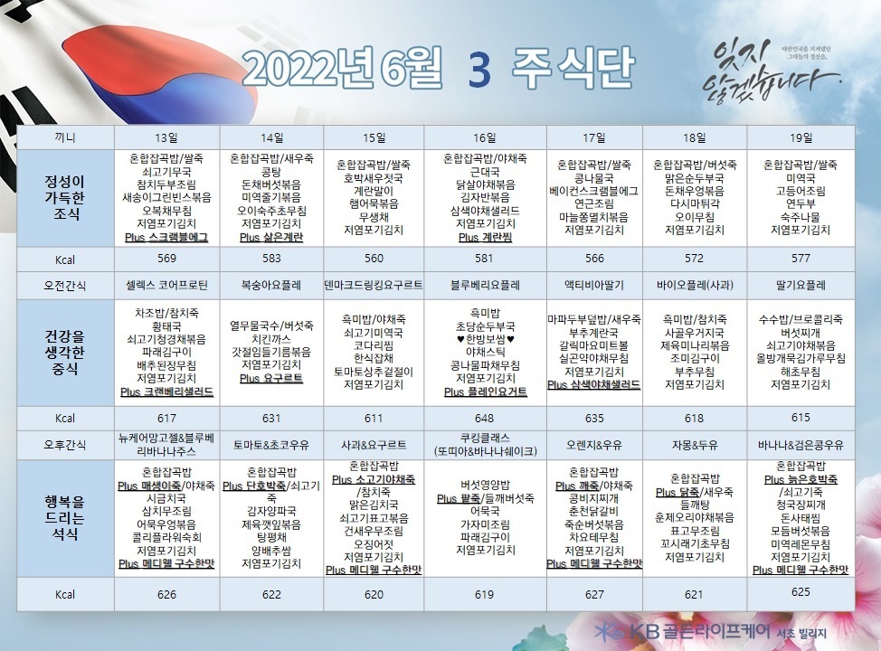 서초빌리지 [식단안내] 서초 빌리지 6월 3주차 식단표 페이지 정보 작성자 KB 골든라이프케어 댓글 0건 조회 2,558회 작성일 22-06-10 11:22 목록 본문 목록 이전글[식단안내] 위례 빌리지 6월 3주차 식단표 22.06.10 다음글[오늘의식단] 2022년 6월 7일 화요일 22.06.07
