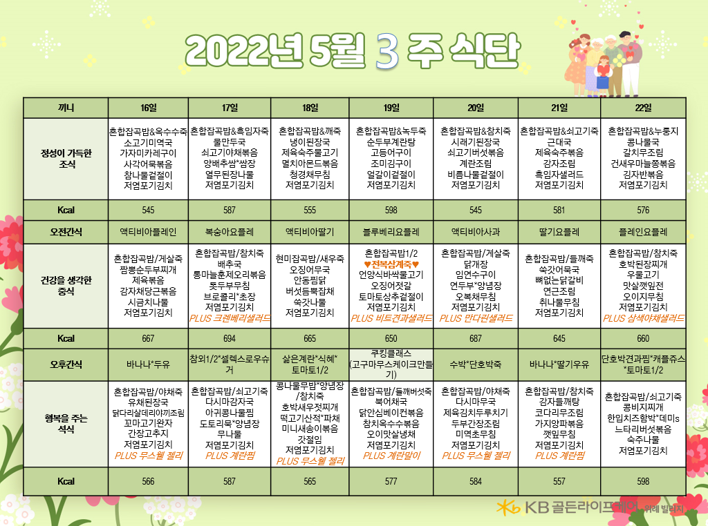 위례빌리지 [식단안내] 위례 빌리지 5월 3주차 식단표 페이지 정보 작성자 KB 골든라이프케어 댓글 0건 조회 2,817회 작성일 22-05-13 10:54 목록 본문 목록 이전글[식단안내] 위례 케어센터 5월 3주차 식단표 22.05.13 다음글[ 오늘의 식단 ] 2022년 5월 12일 목요일 22.05.12