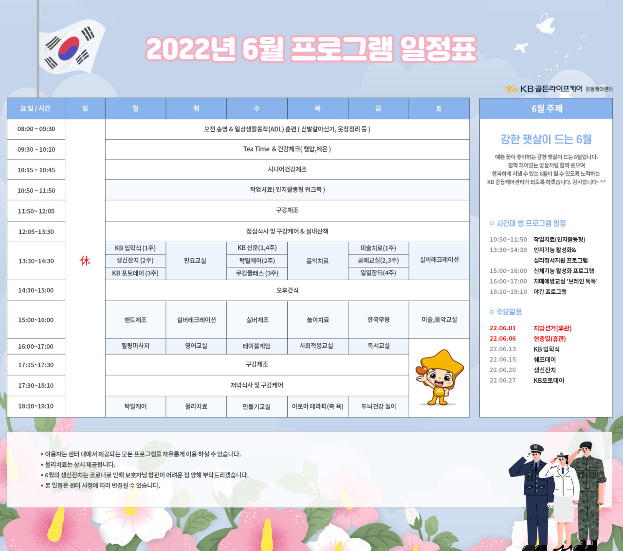 강동케어센터 [프로그램 안내] 2022년 강동케어센터 6월 프로그램 일정표 페이지 정보 작성자 KB 골든라이프케어 댓글 0건 조회 3,726회 작성일 22-05-27 11:00 목록 본문 목록 이전글[식단 안내] 2022년 강동케어센터 6월 식단표 22.05.27 다음글[ 오늘의 식단 ] 2022년 5월 26일 목요일 22.05.26