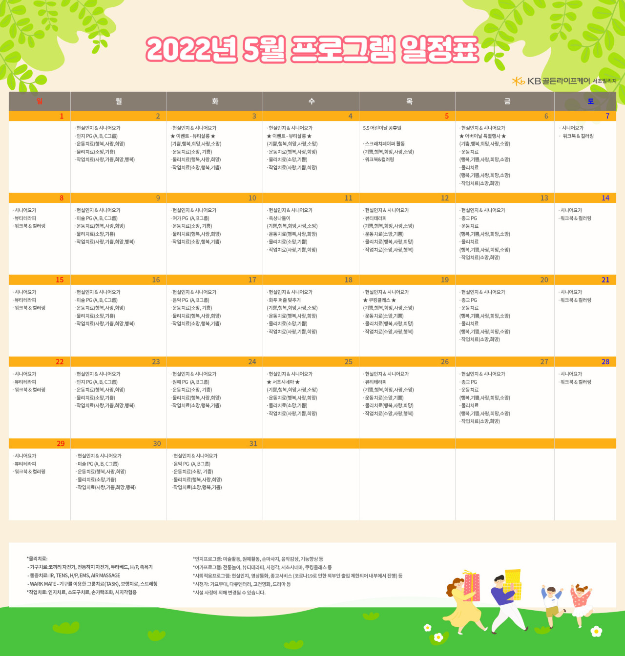 서초빌리지 [프로그램안내] 2022년 서초 빌리지 5월 프로그램 일정표 페이지 정보 작성자 KB 골든라이프케어 댓글 0건 조회 3,268회 작성일 22-04-28 11:34 목록 본문 목록 이전글[프로그램 안내] 2022년 강동케어센터 5월 프로그램 22.04.28 다음글[프로그램 안내] 2022년 위례 케어센터 5월 프로그램 일정표 22.04.27