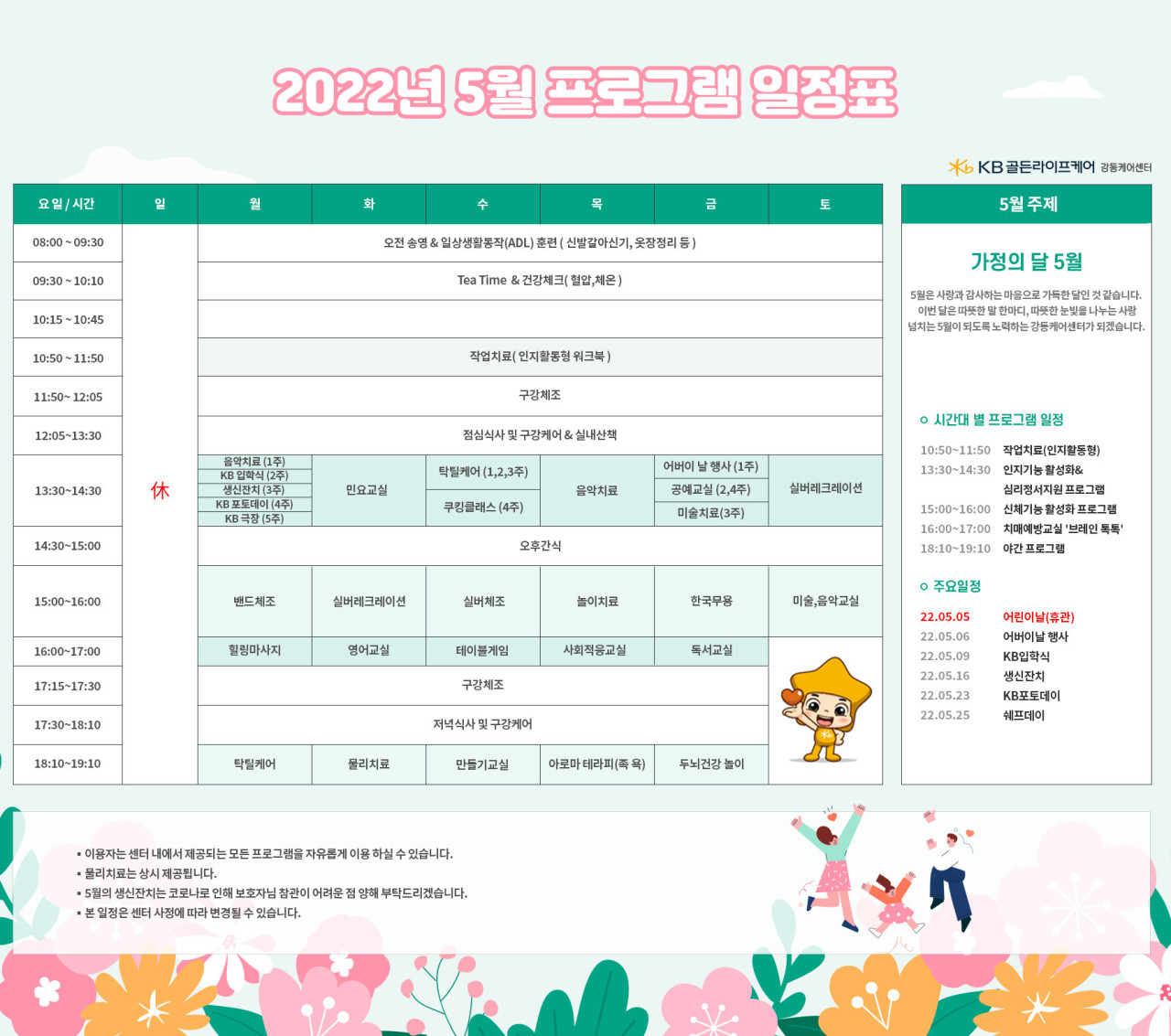 강동케어센터 [프로그램 안내] 2022년 강동케어센터 5월 프로그램 페이지 정보 작성자 KB 골든라이프케어 댓글 0건 조회 2,549회 작성일 22-04-28 17:45 목록 본문 목록 이전글[식단 안내] 2022년 강동케어센터 5월 식단표 22.04.28 다음글[프로그램안내] 2022년 서초 빌리지 5월 프로그램 일정표 22.04.28