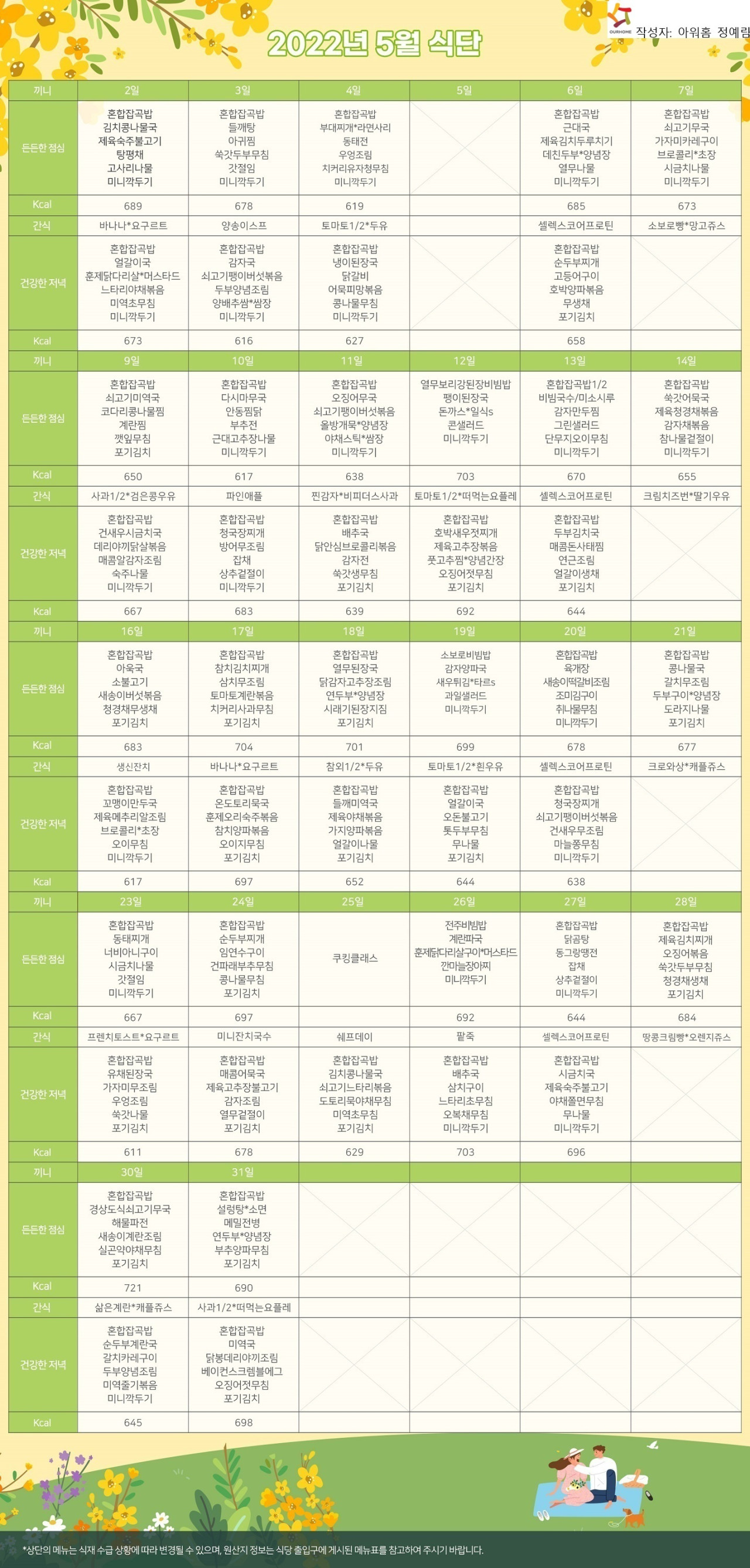 강동케어센터 [식단 안내] 2022년 강동케어센터 5월 식단표 페이지 정보 작성자 KB 골든라이프케어 댓글 0건 조회 2,755회 작성일 22-04-28 17:46 목록 본문 목록 이전글[프로그램 안내] 2022년 위례 빌리지 5월 프로그램 일정표 22.04.29 다음글[프로그램 안내] 2022년 강동케어센터 5월 프로그램 22.04.28