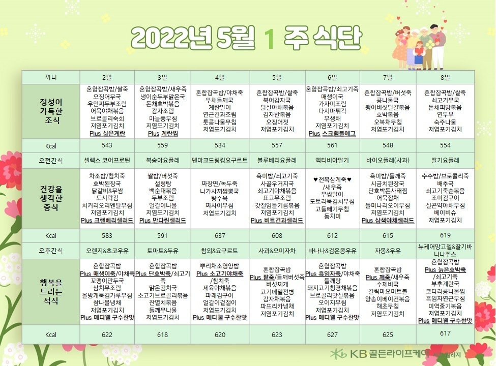 서초빌리지 [식단안내] 서초 빌리지 5월 1주차 식단표 페이지 정보 작성자 KB 골든라이프케어 댓글 0건 조회 2,801회 작성일 22-04-29 13:52 목록 본문 목록 이전글[식단안내] 위례 빌리지 5월 1주차 식단표 22.04.29 다음글[프로그램 안내] 2022년 위례 빌리지 5월 프로그램 일정표 22.04.29