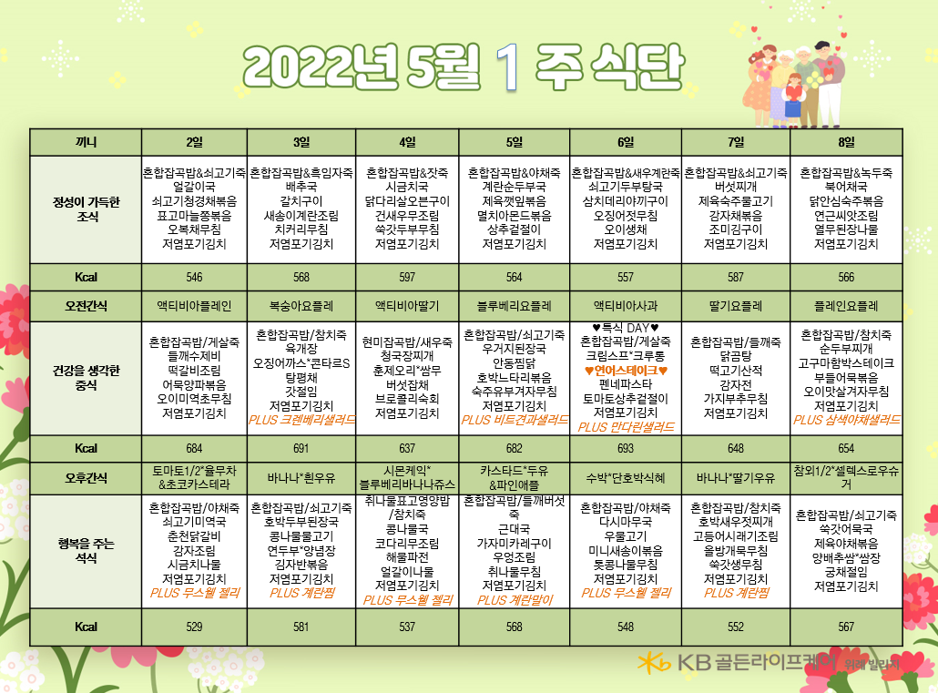 위례빌리지 [식단안내] 위례 빌리지 5월 1주차 식단표 페이지 정보 작성자 KB 골든라이프케어 댓글 0건 조회 2,803회 작성일 22-04-29 17:32 목록 본문 목록 이전글[식단안내] 위례 케어센터 5월 1주차 식단표 22.04.29 다음글[식단안내] 서초 빌리지 5월 1주차 식단표 22.04.29