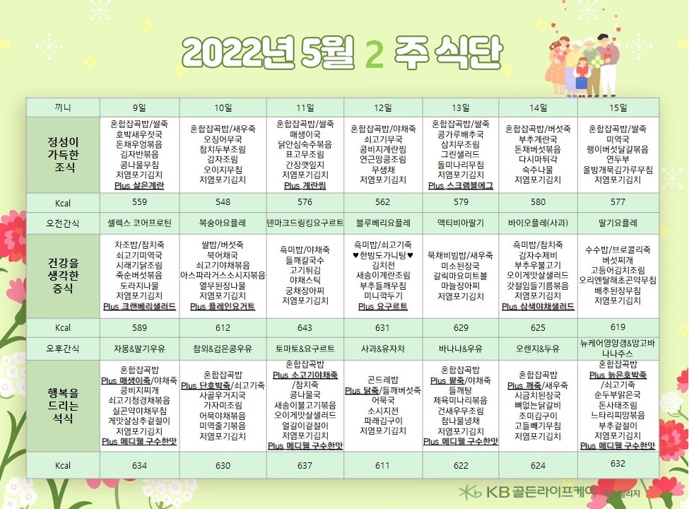 서초빌리지 [식단안내] 서초 빌리지 5월 2주차 식단표 페이지 정보 작성자 KB 골든라이프케어 댓글 0건 조회 2,729회 작성일 22-05-06 14:25 목록 본문 목록 이전글[식단안내] 위례 빌리지 5월 2주차 식단표 22.05.06 다음글[오늘의식단] 2022년 5월 3일 화요일 22.05.03