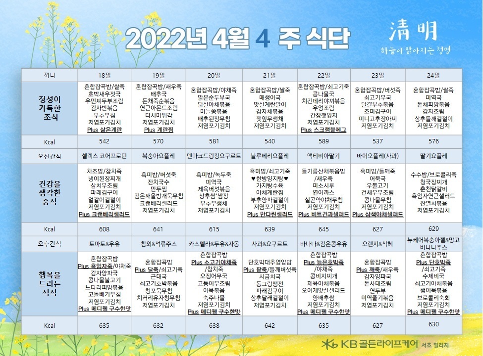 서초빌리지 [식단안내] 서초 빌리지 4월 4주차 식단표 페이지 정보 작성자 KB 골든라이프케어 댓글 0건 조회 2,721회 작성일 22-04-15 12:38 목록 본문 목록 이전글[오늘의식단] 2022년 4월 19일 화요일 22.04.19 다음글[식단안내] 위례 케어센터 4월 3주차 식단표 22.04.15