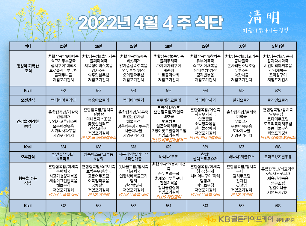 위례빌리지 [식단안내] 위례 빌리지 4월 4주차 식단표 페이지 정보 작성자 KB 골든라이프케어 댓글 0건 조회 2,631회 작성일 22-04-22 14:23 목록 본문 목록 이전글[식단안내] 위례 케어센터 4월 4주차 식단표 22.04.22 다음글[ 오늘의 식단 ] 2022년 4월20일 수요일 22.04.20