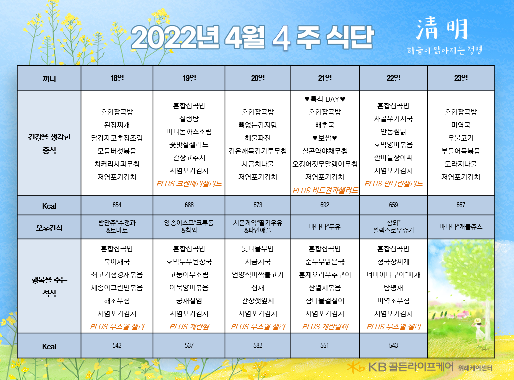 위례케어센터 [식단안내] 위례 케어센터 4월 4주차 식단표 페이지 정보 작성자 KB 골든라이프케어 댓글 0건 조회 2,668회 작성일 22-04-22 14:24 목록 본문 목록 이전글[식단안내] 서초 빌리지 4월 5주차 식단표 22.04.23 다음글[식단안내] 위례 빌리지 4월 4주차 식단표 22.04.22