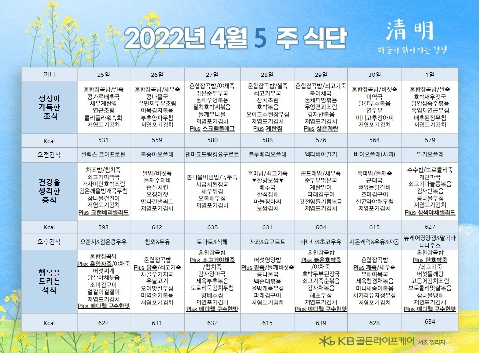 서초빌리지 [식단안내] 서초 빌리지 4월 5주차 식단표 페이지 정보 작성자 KB 골든라이프케어 댓글 0건 조회 2,714회 작성일 22-04-23 11:56 목록 본문 목록 이전글[오늘의식단] 2022년 4월 26일 화요일 22.04.26 다음글[식단안내] 위례 케어센터 4월 4주차 식단표 22.04.22