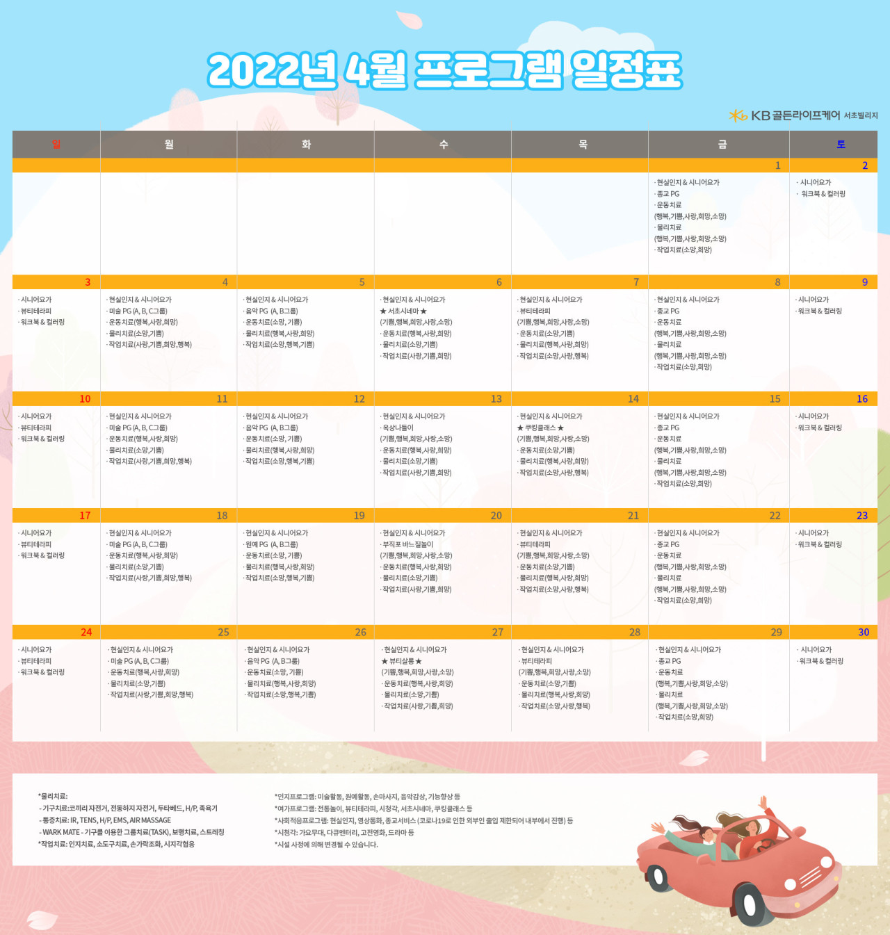 서초빌리지 [프로그램안내] 2022년 서초 빌리지 4월 프로그램 일정표 페이지 정보 작성자 KB 골든라이프케어 댓글 0건 조회 3,387회 작성일 22-03-29 14:09 목록 본문 목록 이전글[프로그램 안내] 2022년 위례 케어센터 4월 프로그램 일정표 22.03.29 다음글[오늘의식단] 2022년 3월 29일 화요일 22.03.29
