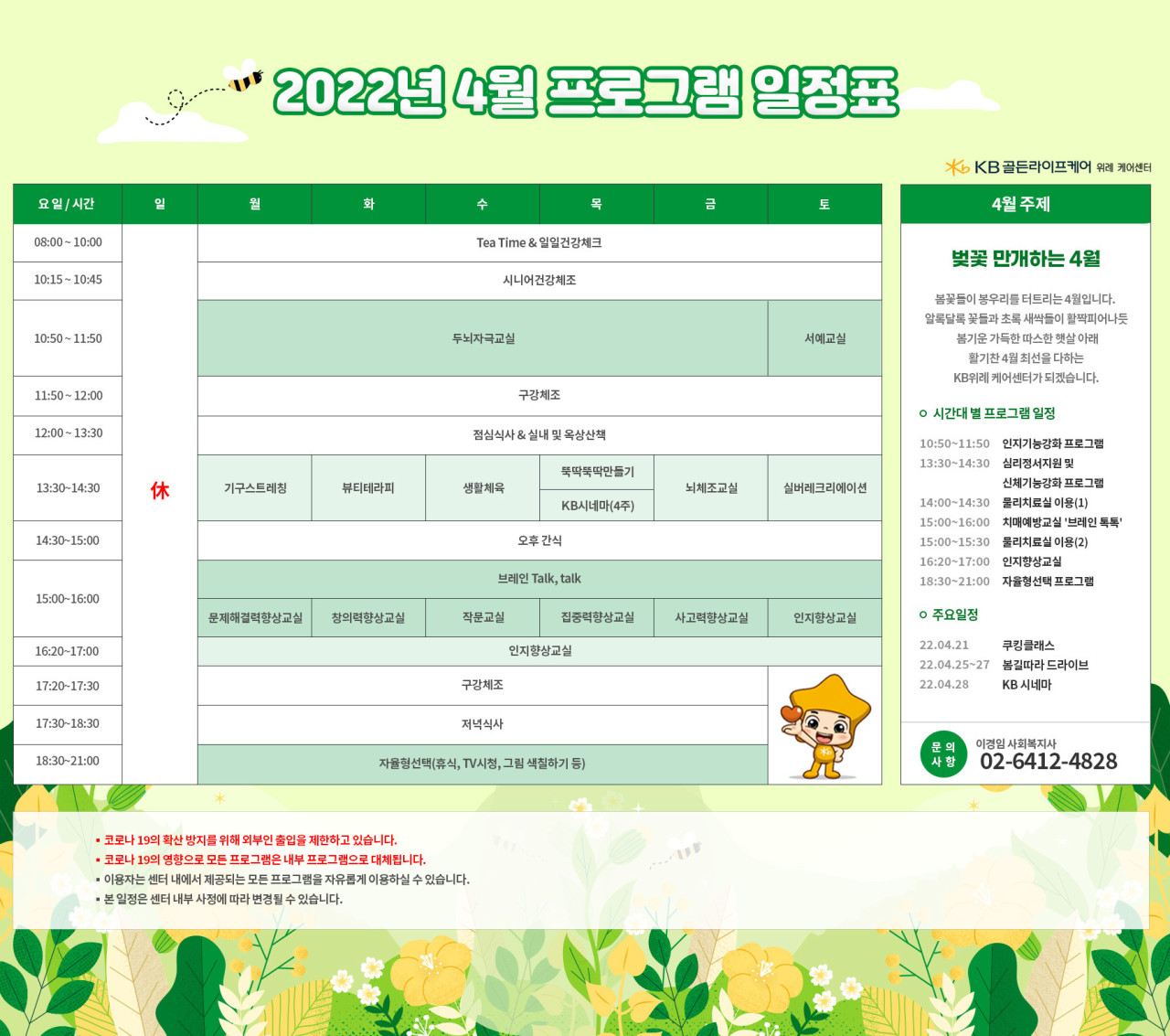 위례케어센터 [프로그램 안내] 2022년 위례 케어센터 4월 프로그램 일정표 페이지 정보 작성자 KB 골든라이프케어 댓글 0건 조회 2,558회 작성일 22-03-29 15:42 목록 본문 목록 이전글[프로그램 안내] 2022년 강동케어센터 4월 프로그램 22.03.30 다음글[프로그램안내] 2022년 서초 빌리지 4월 프로그램 일정표 22.03.29