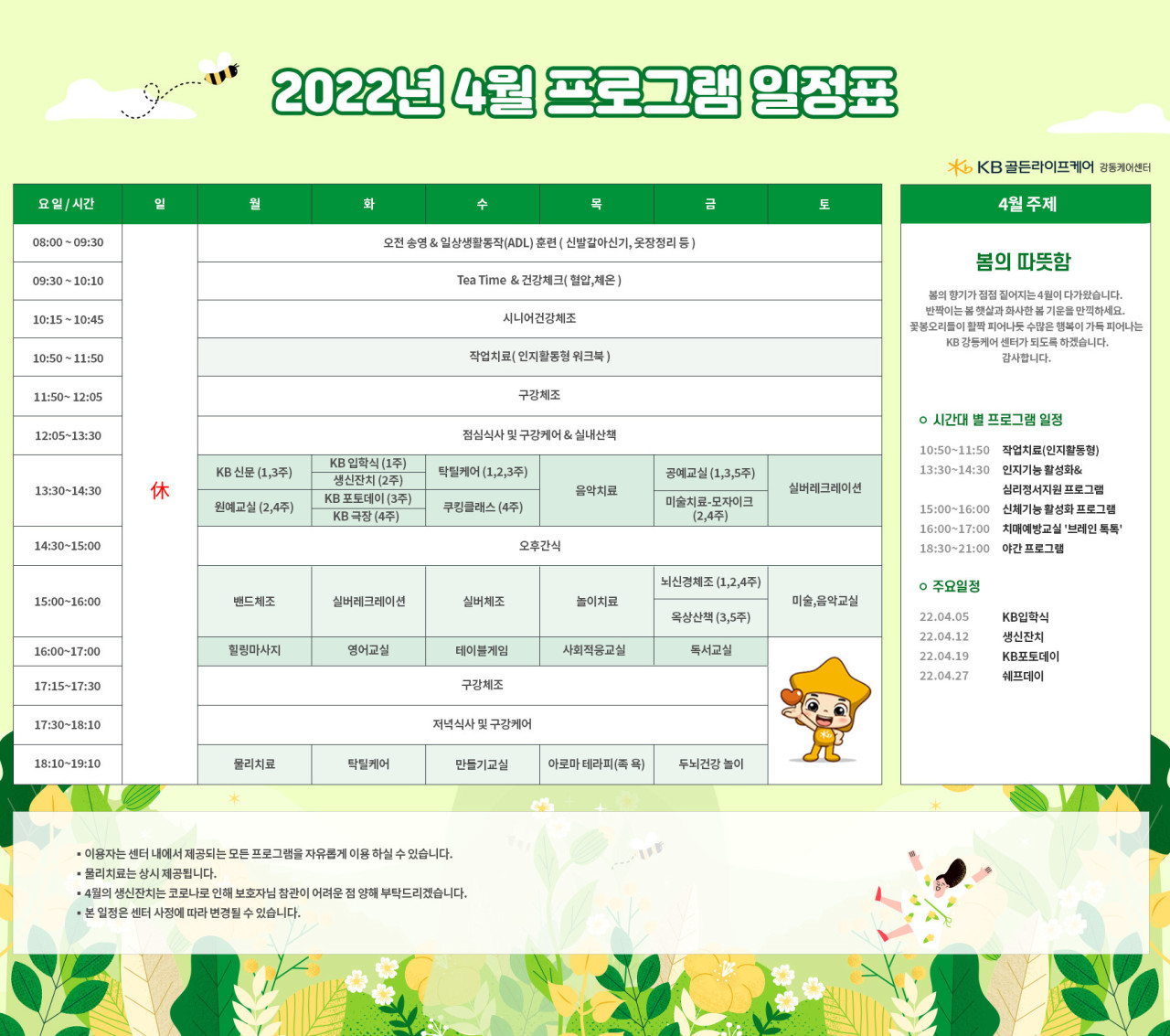 강동케어센터 [프로그램 안내] 2022년 강동케어센터 4월 프로그램 페이지 정보 작성자 KB 골든라이프케어 댓글 0건 조회 2,754회 작성일 22-03-30 12:45 목록 본문 목록 이전글[식단 안내] 2022년 강동케어센터 4월 식단표 22.03.30 다음글[프로그램 안내] 2022년 위례 케어센터 4월 프로그램 일정표 22.03.29
