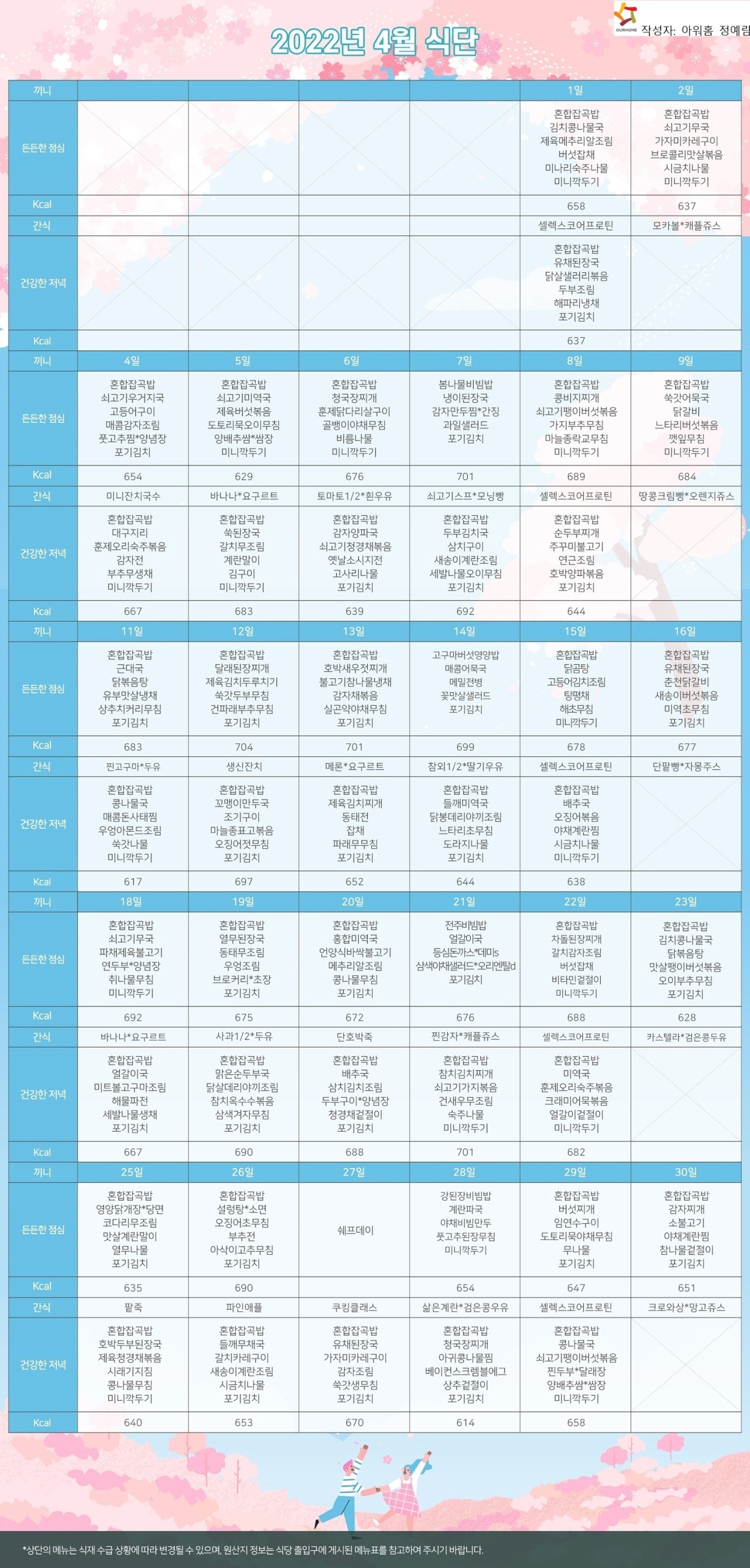 강동케어센터 [식단 안내] 2022년 강동케어센터 4월 식단표 페이지 정보 작성자 KB 골든라이프케어 댓글 0건 조회 2,746회 작성일 22-03-30 12:46 목록 본문 목록 이전글[프로그램 안내] 2022년 위례 빌리지 4월 프로그램 일정표 22.03.31 다음글[프로그램 안내] 2022년 강동케어센터 4월 프로그램 22.03.30