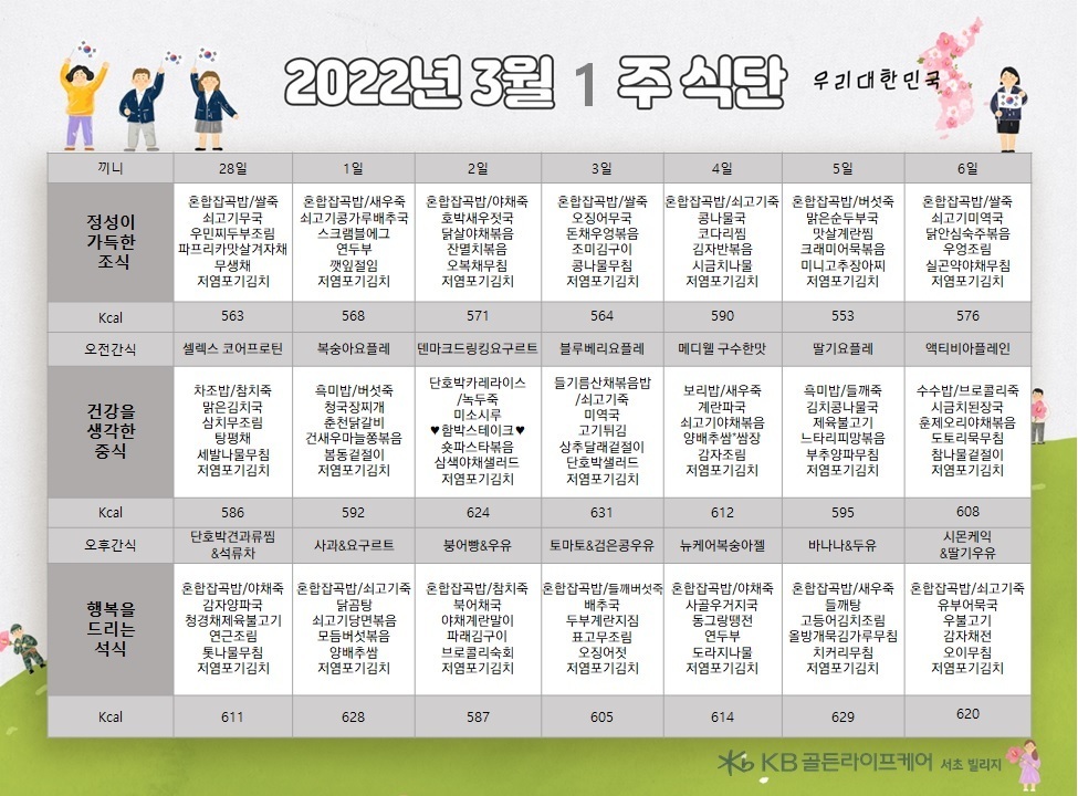 서초빌리지 [식단안내] 서초 빌리지 3월 1주차 식단표 페이지 정보 작성자 KB 골든라이프케어 댓글 0건 조회 2,726회 작성일 22-02-25 12:06 목록 본문 목록 이전글[식단안내] 위례 빌리지 3월 1주차 식단표 22.02.25 다음글[ 오늘의 식단 ] 2022년 2월22일 화요일 22.02.22