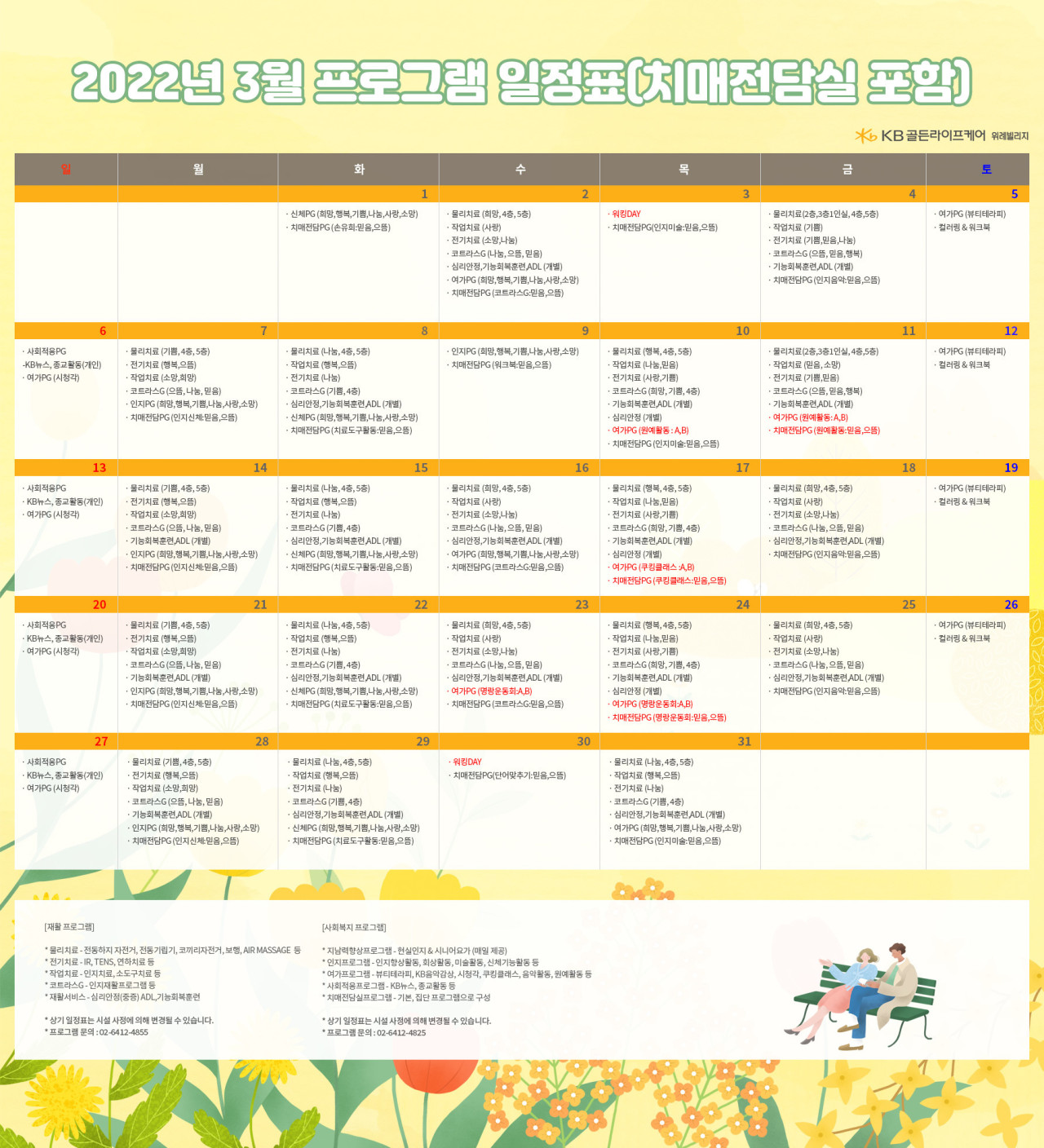 위례빌리지 [프로그램 안내] 2022년 위례 빌리지 3월 프로그램 일정표 페이지 정보 작성자 KB 골든라이프케어 댓글 0건 조회 3,218회 작성일 22-02-28 17:46 목록 본문 목록 이전글[프로그램안내] 2022년 서초 빌리지 3월 프로그램 일정표 22.02.28 다음글[식단안내] 위례 케어센터 3월 1주차 식단표 22.02.25