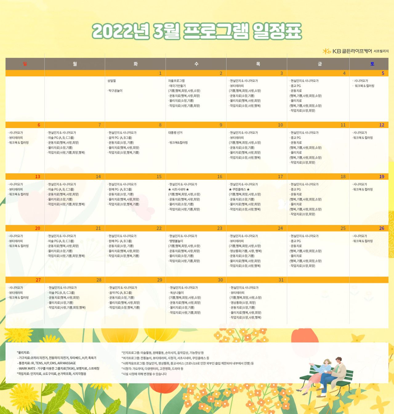 서초빌리지 [프로그램안내] 2022년 서초 빌리지 3월 프로그램 일정표 페이지 정보 작성자 KB 골든라이프케어 댓글 0건 조회 3,334회 작성일 22-02-28 18:25 목록 본문 목록 이전글[프로그램 안내] 2022년 강동케어센터 3월 프로그램 22.03.02 다음글[프로그램 안내] 2022년 위례 빌리지 3월 프로그램 일정표 22.02.28