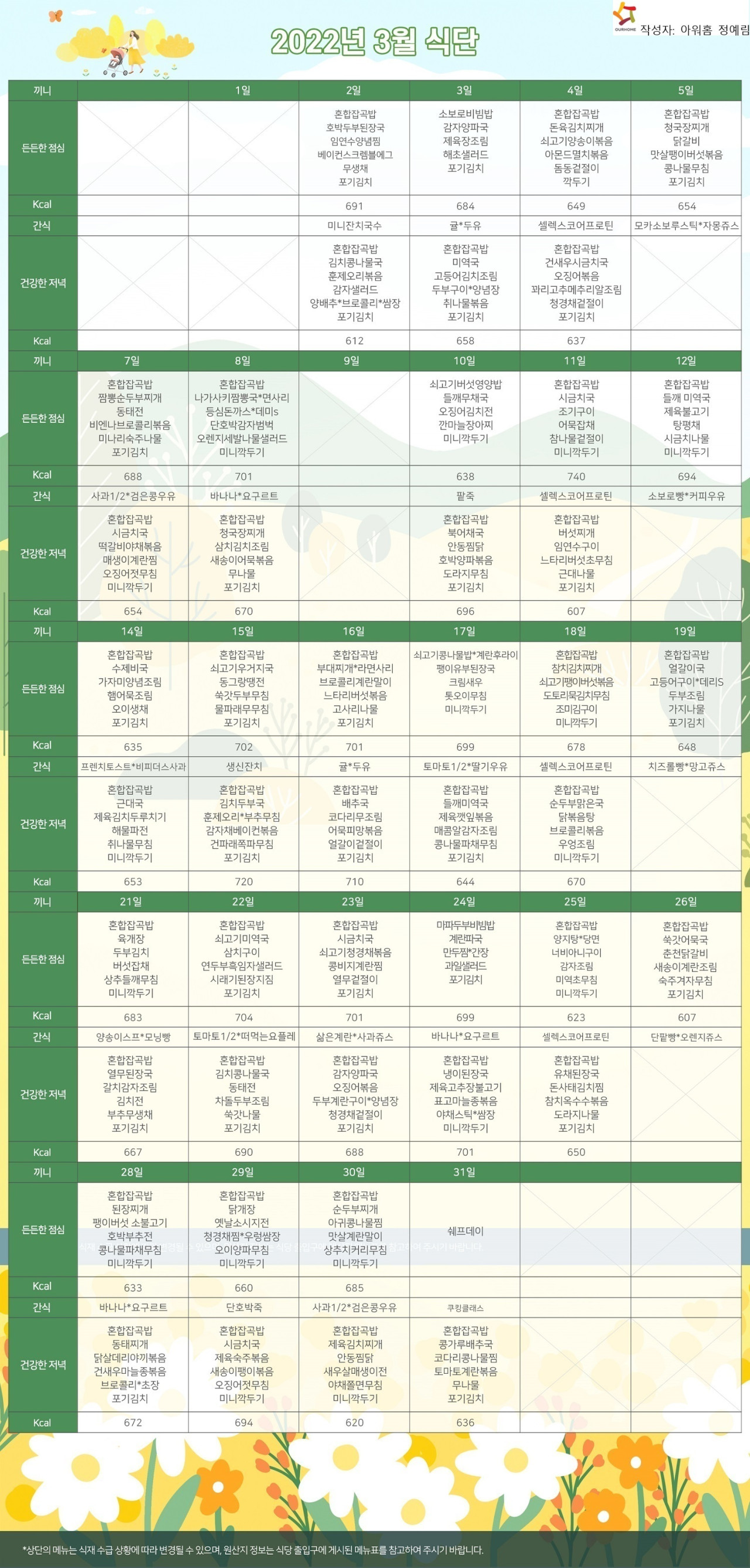 강동케어센터 [식단 안내] 2022년 강동케어센터 3월 식단표 페이지 정보 작성자 KB 골든라이프케어 댓글 0건 조회 2,774회 작성일 22-03-02 14:30 목록 본문 목록 이전글[오늘의 식단] 2022년 3월 2일 수요일 22.03.02 다음글[프로그램 안내] 2022년 강동케어센터 3월 프로그램 22.03.02