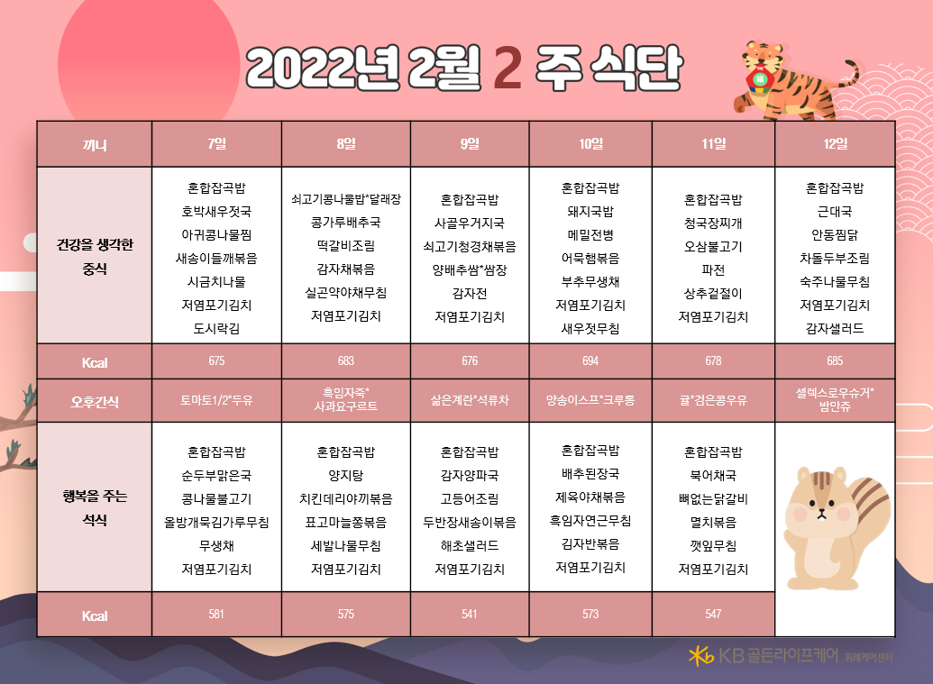 위례케어센터 [식단안내] 위례 케어센터 2월 2주차 식단표 페이지 정보 작성자 KB 골든라이프케어 댓글 0건 조회 2,726회 작성일 22-02-04 16:12 목록 본문 목록 이전글[오늘의 식단] 2022년 2월 4일 금요일 22.02.04 다음글[식단안내] 위례 빌리지 2월 2주차 식단표 22.02.04