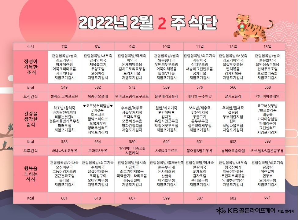 서초빌리지 [식단안내] 서초 빌리지 2월 2주차 식단표 페이지 정보 작성자 KB 골든라이프케어 댓글 0건 조회 2,912회 작성일 22-02-07 11:02 목록 본문 목록 이전글[오늘의식단] 2022년 2월 8일 화요일 22.02.08 다음글[오늘의 식단] 2022년 2월 4일 금요일 22.02.04