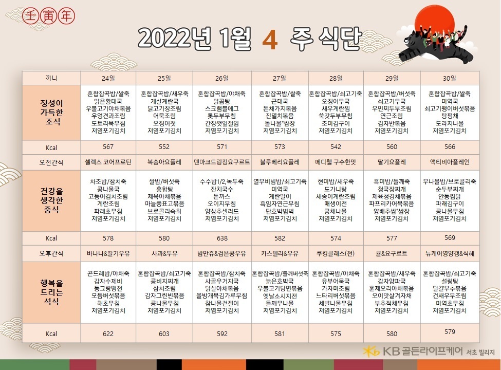 서초빌리지 [식단안내] 서초 빌리지 1월 4주차 식단표 페이지 정보 작성자 KB 골든라이프케어 댓글 0건 조회 2,962회 작성일 22-01-21 12:47 목록 본문 목록 이전글[오늘의식단] 2022년 1월 25일 화요일 22.01.25 다음글[식단안내] 위례 케어센터 1월 5주차 식단표 22.01.21