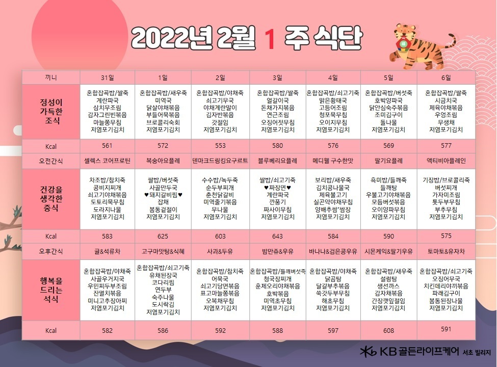 서초빌리지 [식단안내] 서초 빌리지 2월 1주차 식단표 페이지 정보 작성자 KB 골든라이프케어 댓글 0건 조회 2,868회 작성일 22-01-28 13:33 목록 본문 목록 이전글[ 오늘의 식단 ] 2022년 1월28일 금요일 22.01.28 다음글[프로그램 안내] 2022년 위례 케어센터 2월 프로그램 일정표 22.01.27