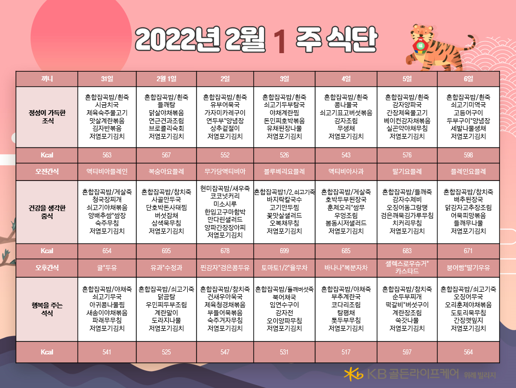 위례빌리지 [식단안내] 위례 빌리지 2월 1주차 식단표 페이지 정보 작성자 KB 골든라이프케어 댓글 0건 조회 2,803회 작성일 22-01-28 14:44 목록 본문 목록 이전글[식단안내] 위례 케어센터 2월 1주차 식단표 22.01.28 다음글[ 오늘의 식단 ] 2022년 1월28일 금요일 22.01.28