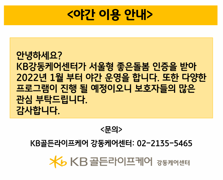 강동케어센터 [야간이용안내] 야간이용서비스 안내 페이지 정보 작성자 KB 골든라이프케어 댓글 0건 조회 2,041회 작성일 22-01-03 16:21 목록 본문 목록 이전글[오늘의식단] 2022년 1월 4일 화요일 22.01.04 다음글[프로그램 안내] 2022년 서초 빌리지 1월 프로그램 일정표 22.01.01