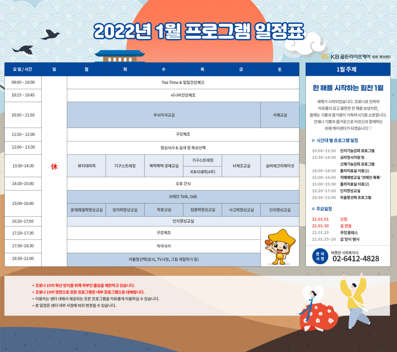 위례케어센터 [프로그램 안내] 2022년 위례 케어센터 1월 프로그램 일정표 페이지 정보 작성자 KB 골든라이프케어 댓글 0건 조회 4,433회 작성일 22-01-06 17:26 목록 본문 목록 이전글[식단안내] 위례 빌리지 1월 3주차 식단표 22.01.07 다음글[오늘의식단] 2022년 1월 4일 화요일 22.01.04