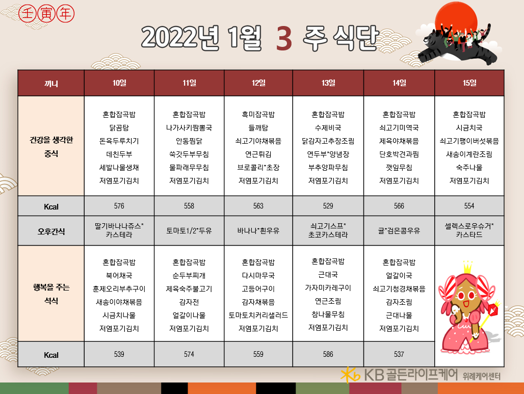 위례케어센터 [식단안내] 위례 케어센터 1월 3주차 식단표 페이지 정보 작성자 KB 골든라이프케어 댓글 0건 조회 2,757회 작성일 22-01-07 11:56 목록 본문 목록 이전글[식단안내] 서초 빌리지 1월 2주차 식단표 22.01.07 다음글[식단안내] 위례 빌리지 1월 3주차 식단표 22.01.07