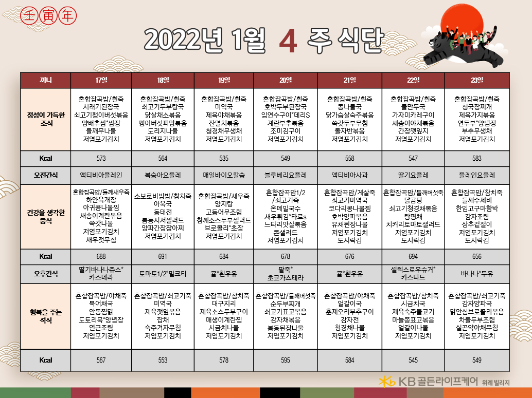 위례빌리지 [식단안내] 위례 빌리지 1월 4주차 식단표 페이지 정보 작성자 KB 골든라이프케어 댓글 0건 조회 2,898회 작성일 22-01-14 10:55 목록 본문 목록 이전글[식단안내] 위례 케어센터 1월 4주차 식단표 22.01.14 다음글[식단안내] 서초 빌리지 1월 3주차 식단표 22.01.14