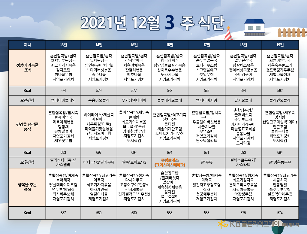 위례빌리지 [식단안내] 위례 빌리지 12월 3주차 식단표 페이지 정보 작성자 KB 골든라이프케어 댓글 0건 조회 2,889회 작성일 21-12-10 14:21 목록 본문 목록 이전글[식단안내] 위례 케어센터 12월 3주차 식단표 21.12.10 다음글[식단안내] 서초빌리지 12월 3주차 식단표 21.12.10