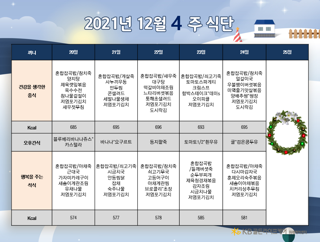 위례케어센터 [식단안내] 위례 케어센터 12월 4주차 식단표 페이지 정보 작성자 KB 골든라이프케어 댓글 0건 조회 2,977회 작성일 21-12-17 12:43 목록 본문 목록 이전글[오늘의 식단] 2021년 12월 17일 금요일 21.12.17 다음글[식단안내] 위례 빌리지 12월 4주차 식단표 21.12.17