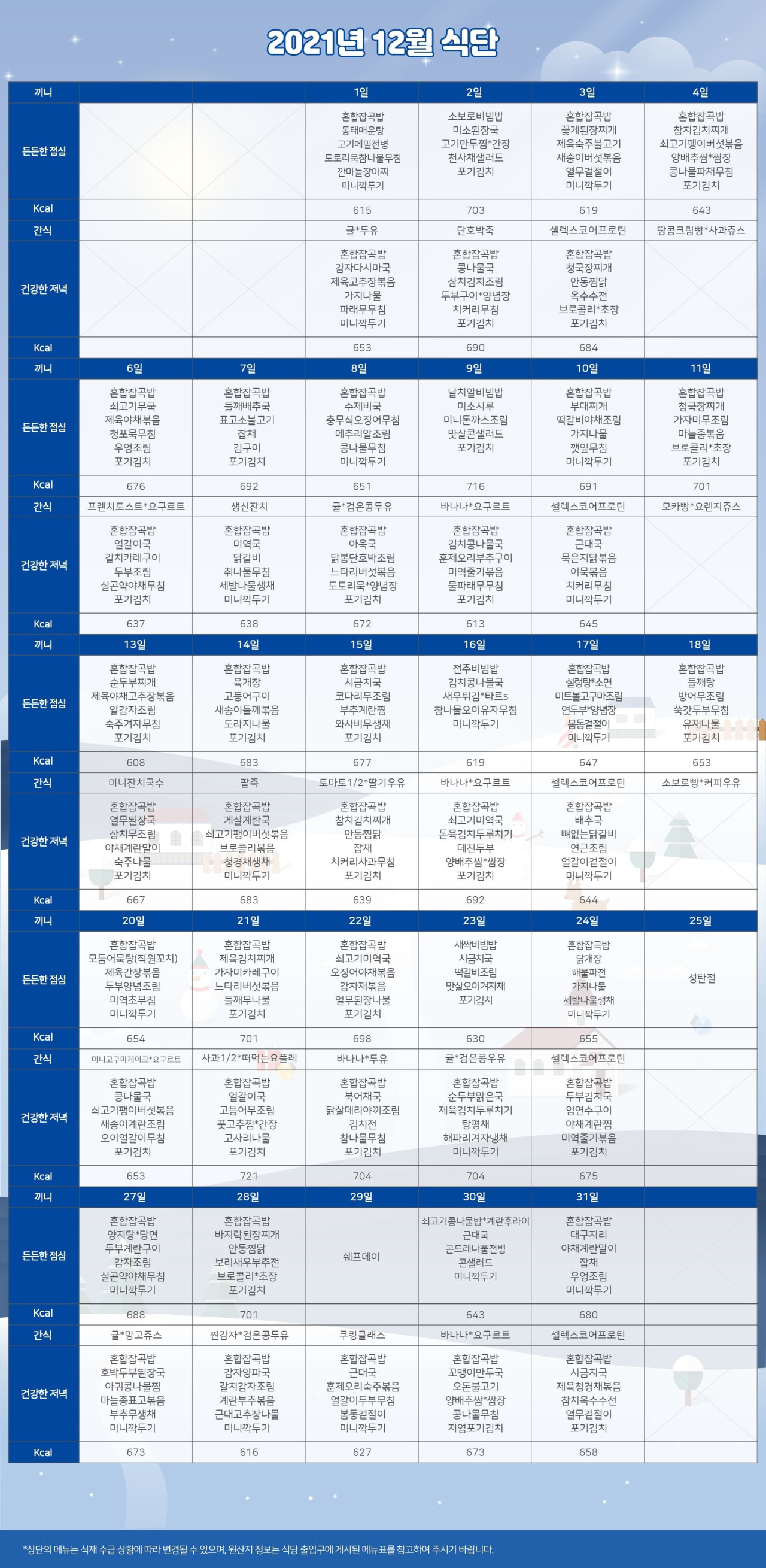 강동케어센터 [식단 안내] 2021년 강동케어센터 12월 식단표 페이지 정보 작성자 KB 골든라이프케어 댓글 0건 조회 2,993회 작성일 21-11-29 08:33 목록 본문 목록 이전글[프로그램 안내] 2021년 강동케어센터 12월 프로그램 21.11.29 다음글[오늘의 식단] 2021년11월27일토요일 21.11.27