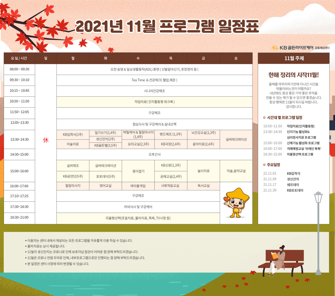 강동케어센터 [프로그램 안내] 2021년 강동케어센터 11월 프로그램 페이지 정보 작성자 KB 골든라이프케어 댓글 0건 조회 2,822회 작성일 21-10-29 09:16 목록 본문 목록 이전글[프로그램 안내] 2021년 위례 빌리지 11월 프로그램 일정표 21.10.29 다음글[식단 안내] 2021년 강동케어센터 11월 식단표 21.10.29